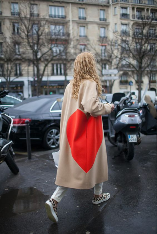 裸色的外衣侧面的红色爱心图案让整体搭配的重心都很好的揭示在身上,让人面前一亮之余不会显得很夸张。