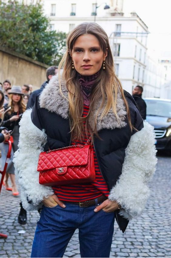 最简单直接的是搭配一个红色的包包,在整体搭配上不会显得很夸张,又有喜庆的一点点的点缀。