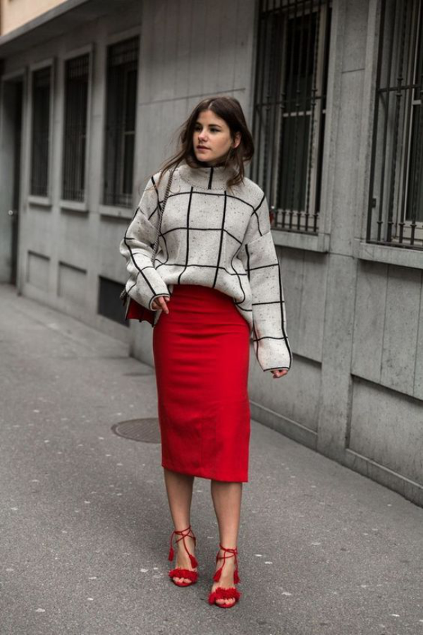 红色紧身裙很是适合喜好女人味的小仙女们,肆意搭配城市女人味实足哦~ 在这个年夜冬天保举过膝的红裙,可以选择 A 字或者紧身的,紧身裙可搭配松身的上衣而 A 字裙可以搭配紧身的上衣,如许整体搭配会显得张弛有度。