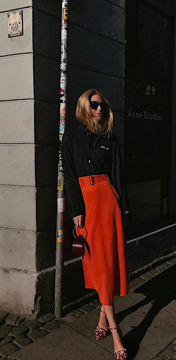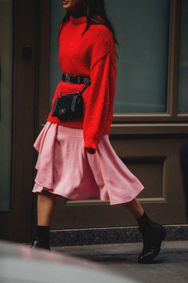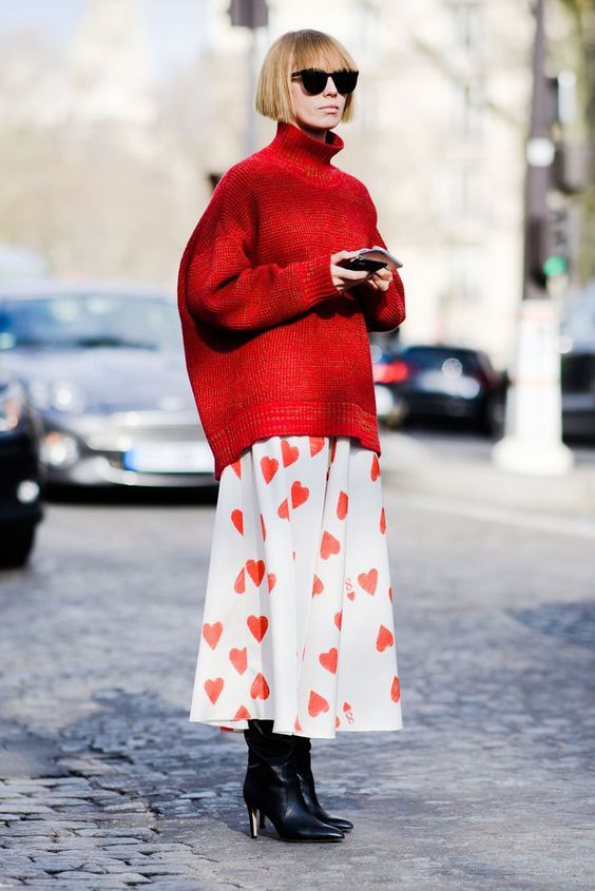 除了红色外衣以外,红色的半身裙,裤子和毛衣都是小仙女们可以斗胆测验考试的,红色的半身在整体搭配上也会增添亮点。一般搭配建议喜好比力不冒险的可以选择白色或者黑色的上下身去搭配红色,白色 + 红色显得崇高风雅,黑色 + 红色显得神秘冷艳。