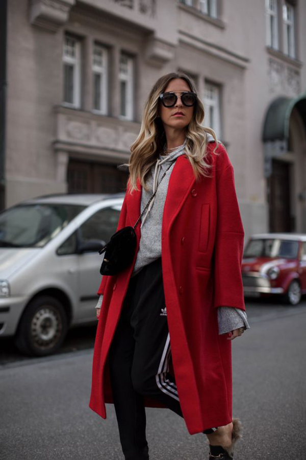 红色外衣的搭配要着重注重版型和剪裁不然很难衬出气质,可是红色的年夜衣外衣真的超适合春节穿哦,斜跨极具复古气息毛线方包,尽显时尚感,内搭白色或其他素色高领卫衣毛衣,时髦显气色。