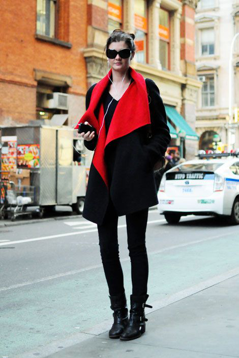 在年夜冬天怎么能少得了领巾,年夜红色领巾在增添保暖之余增添了整体搭配的条理。更适合喜好暗色系穿戴的小仙女们,在暗色的整体搭配加一条年夜红色领巾的确是点睛之笔。