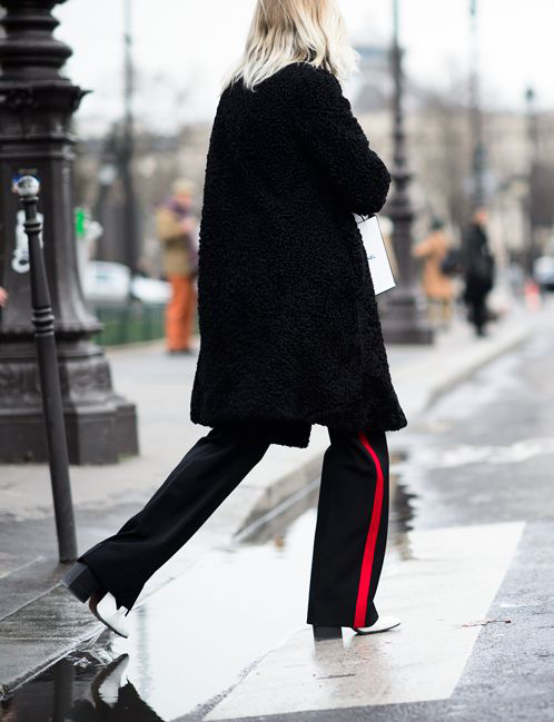 剪裁简单可是面料质地细腻滑腻的富丽风年夜衣很有脱俗的味道,里面搭配简单的毛衣跟紧身裤即可。