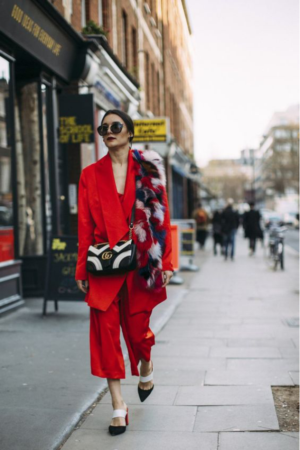 喜好帅气的小仙女们必然要测验考试整套的红色西装,红色西装套装的确帅气到炸裂爆灯,再配上一条临近色的假皮草围脖让整体红色增添条理感。