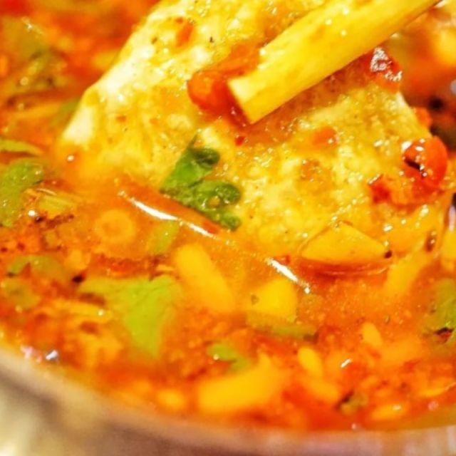 涮啥呢?炸五花肉片带上一层酸鲜浓烈的汤: