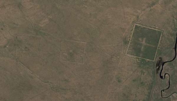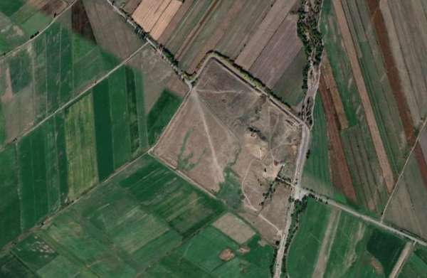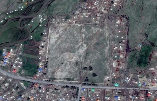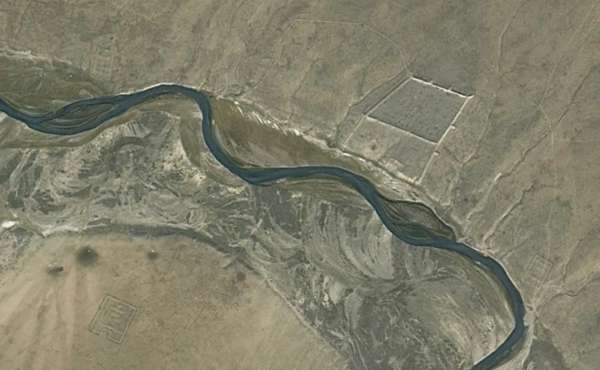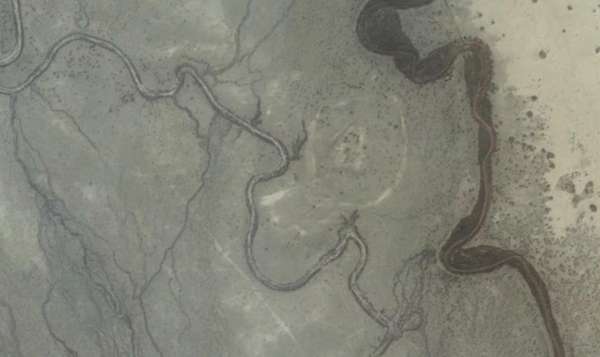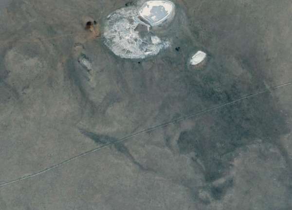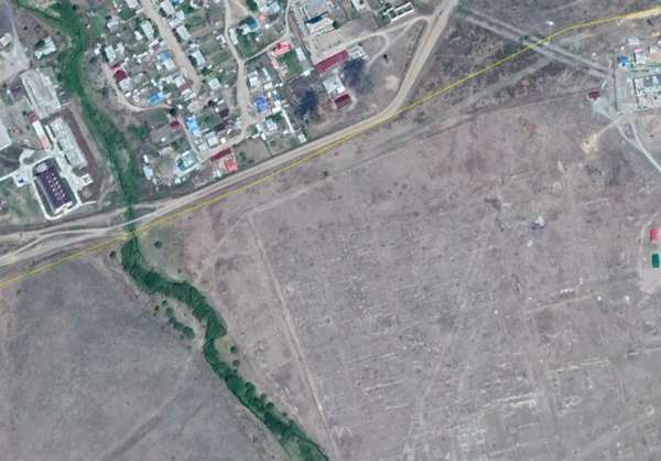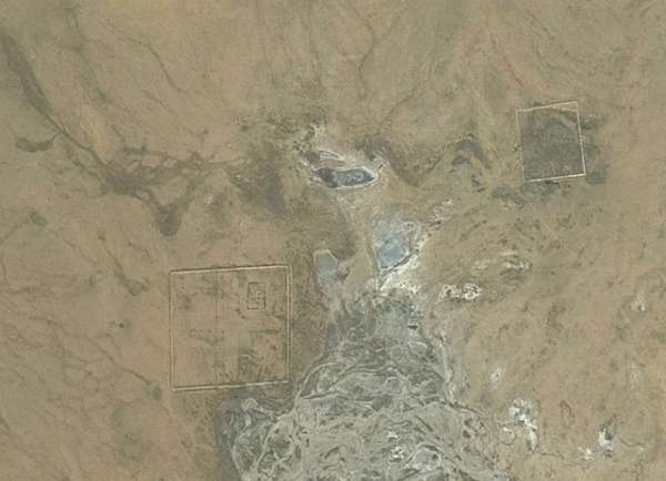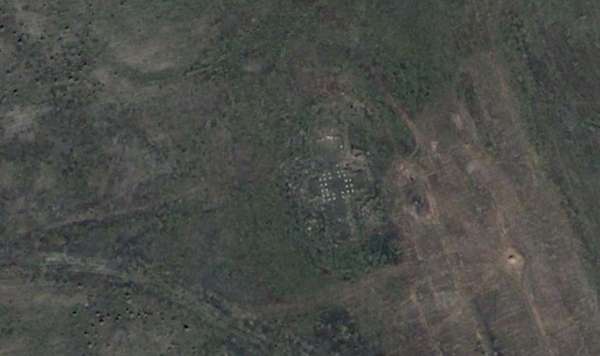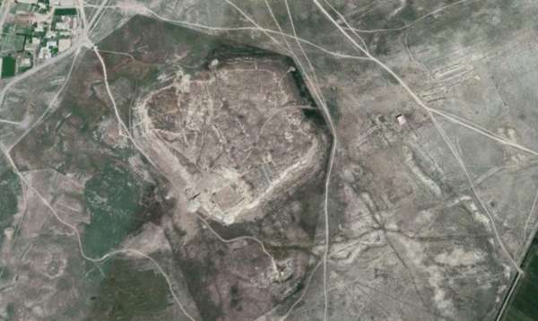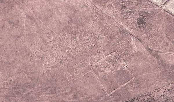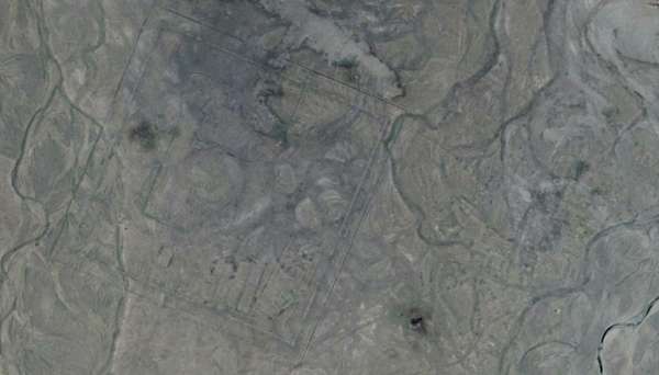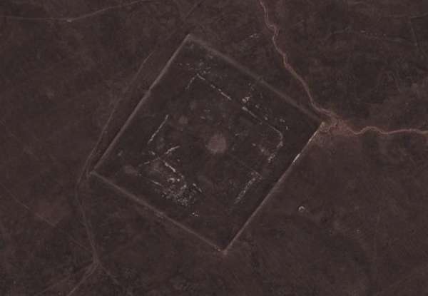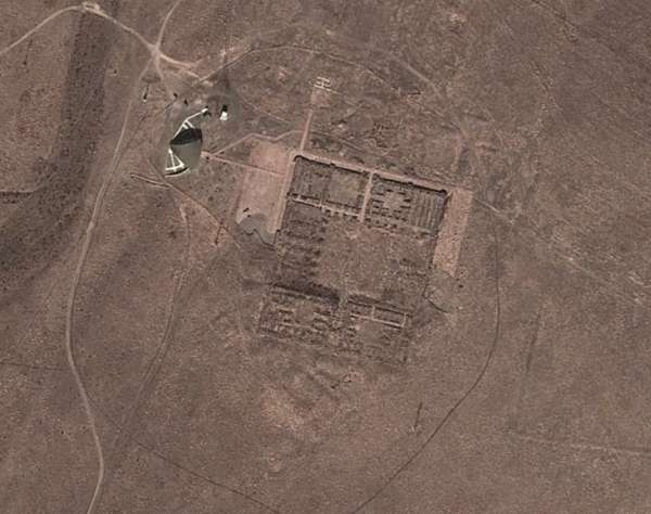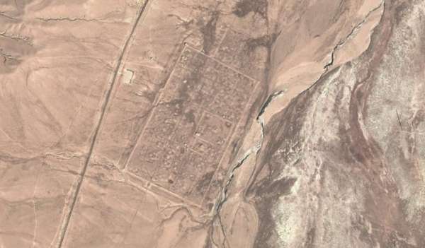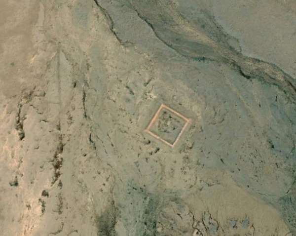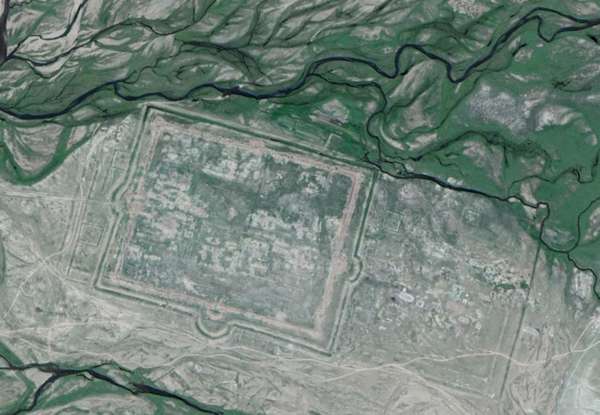 赤石城,在今哈萨克斯坦,丘处机从西辽首都大石林牙(吉尔吉斯斯坦国布拉纳古城)出发,“十有八日,沿山而西。七八日,山忽南去,一石城当路,石色尽赤。有驻军奇迹,西有大冢,若斗星相联”就是这里,石质建筑在卫星俯瞰仍是比夯土较着。