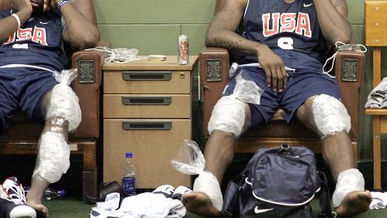 可勒布朗膝盖上绑着的,既不是防护垫,也不是冰袋,而是近些年才逐渐在体育界普及起来的新型真空压缩冰敷袋。
