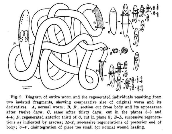 真的没有骗你,科学家真这么说的……图源:REGENERATION IN XEMERTEANS下面这张图展示了 WESLEY R . COE 对纽虫各类精妙的切法,简单来说就是二分法。