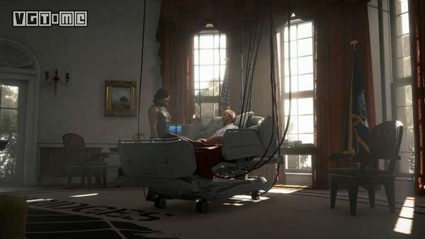 在客岁 E3 发布的预告中,我们曾猜测 Amelie 是 UCA 的总统,预告中呈现的照片就是在白宫的总统办公室。而新预告也证实了这个猜想,今朝看来游戏地点时空中的 Amelie 身患沉痾,所以将“让美国再度完整(Make America whole)”的使命交给了山姆。