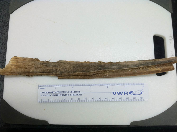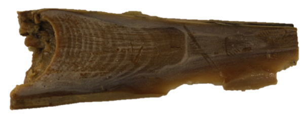这条 10 英寸长的耳屎于 2007 年从一条搁浅的蓝鲸中提掏出来。耳屎是一层一层堆叠出来的,在上面可以看到堆叠的陈迹,这有点近似于年轮。耳屎本家儿要由脂质和角质卵白构成,由深色和淡色的层(发展层群)瓜代构成,大要每半年就叠出一个轮,半斤八两于半年给这些化学物质一个存档。