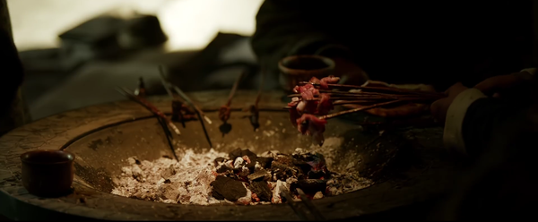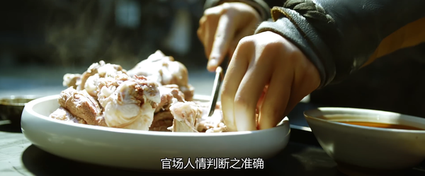 狼卫在藏匿的地址休整饮食,此中一小我拿出树枝穿肉在火盆上烤。狼卫的布景是突厥人,《资治通鉴》讲李承乾爱效仿突厥风尚,吃饭要“作八尺铜炉,六隔大鼎,募亡奴盗平易近间马牛,亲临烹煮”,更“敛羊而烹之,抽刀割肉相啖”,总之就是要有游牧平易近族的霸气。其实不止他,大部门贵族也喜好这种豪放的饮食体例。千年前的肉都是有机的,想想一块鲜杀的羊肉,立即被穿到树枝上,置于炭火上炙烤,油脂滋滋滴着,一口撕咬下去,尚且带粉的肉中心同化几丝血丝,嫩得牙齿打颤。