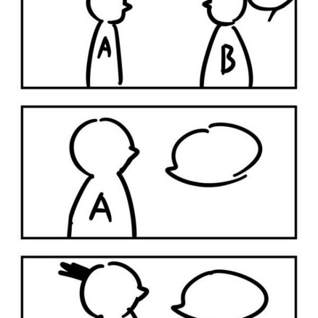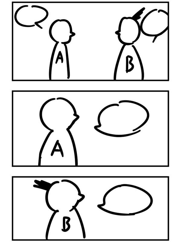 我感觉下面这种不可。好比A和B如下图进行着通俗对话的时辰,总不克不及你画完A朝着右对B说完,下个镜头就跑到B还朝着右对A措辞吧。