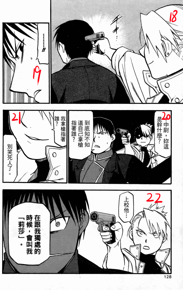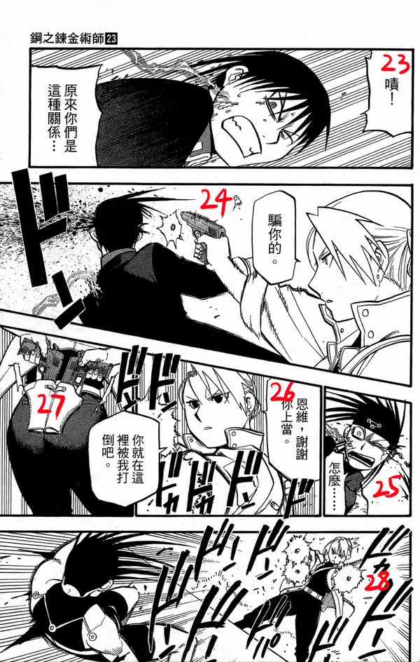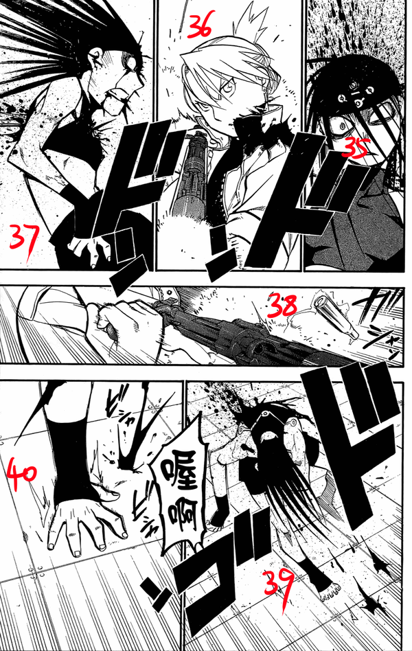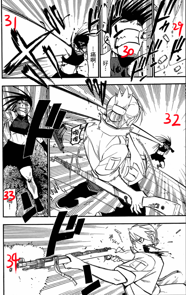 先来看一组对比吧(不要在意数字为啥没从1起头,那是我8年前把这一整段情节拉片子和漫画时标注的)。出自漫画《钢之炼金术师》和其对应的动画《钢炼FA》