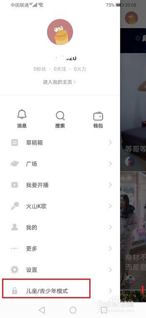 第一步手机上打开抖音火山版侧边栏,下滑到底部,点击儿童/青少年模式,如下图所示: