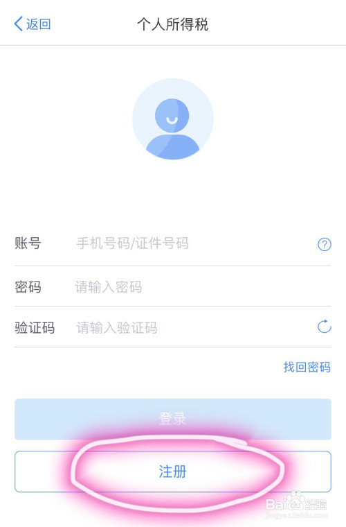 ②第二步,打开小我所得税APP界面后,点击左下方“注册”账号。