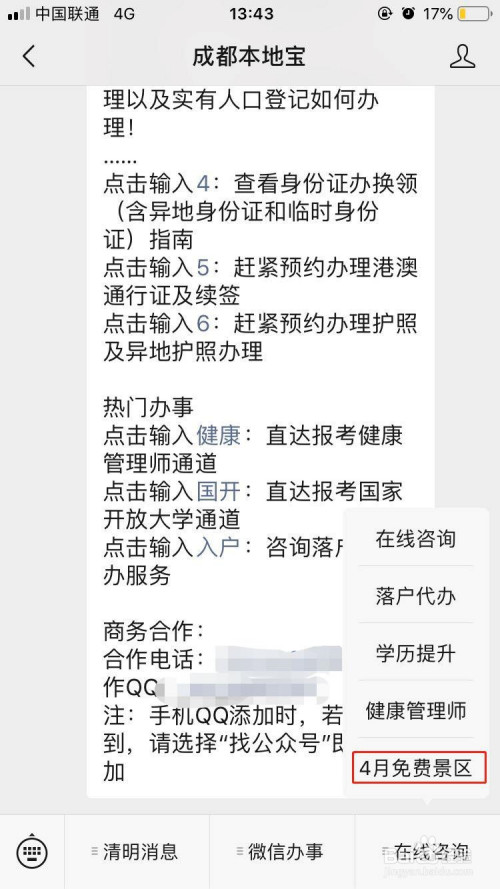 二,选择“当作都当地宝”公家号,点击“在线咨询”,选择“4月免费景区”。