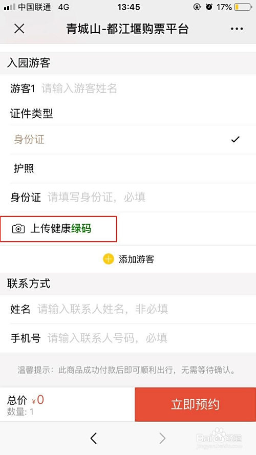 四、点击“当即预约”,进入购票须知界面,然后点击“当即预定”。进入到预定详情界面,如实填写游玩日期,预约数目,消费信息可不填,入园体例以及入园旅客身份信息。