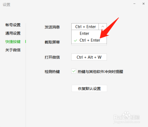 4. 点【快捷按键】,发送动静设置为【Ctr+Enter】。