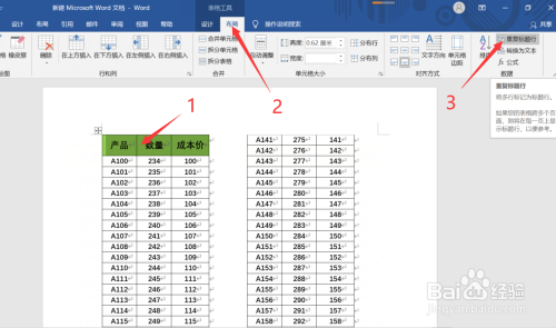第五步:框选表格首列【产物数目当作本价】,在【表格东西】中的【结构】下点击【反复题目行】
