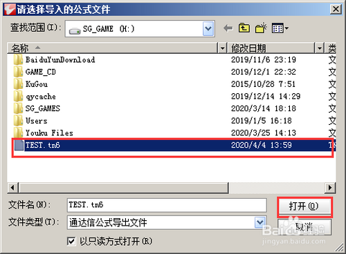 选摘要导入的tn6文件,本例为一个叫test的tn6文件,并点击【打开】按钮。