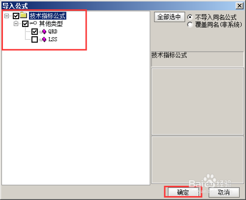 选摘要导入的公式并在其前面打勾,本例中勾选了一个在其他类型下名为QRD的公式,点击右下方【确定】按钮完当作导入操作。