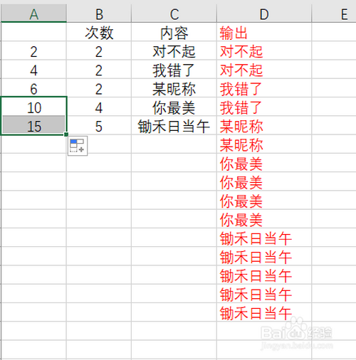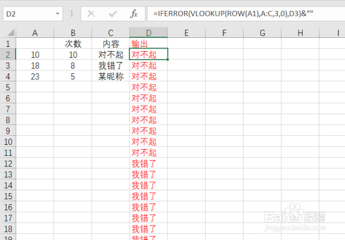 然后,我们再在D2处输入=IFERROR(VLOOKUP(ROW(A1),A:C,3,0),D3)&"" 同理填充