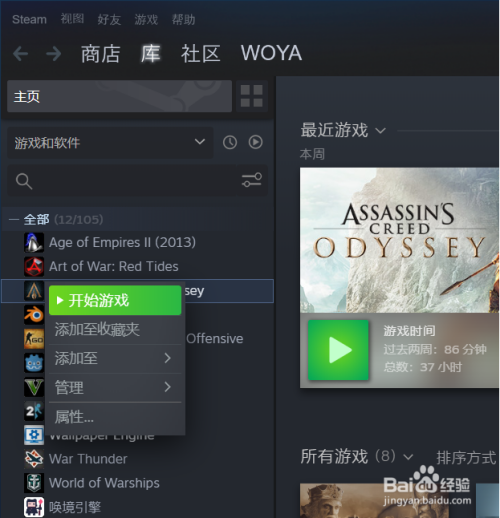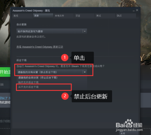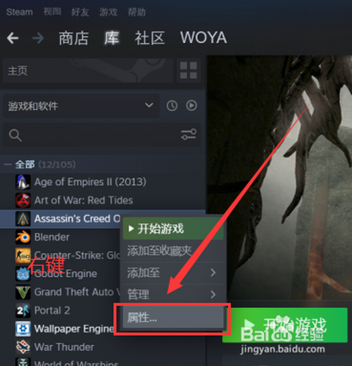 起首我们先把后台主动更新关失落,右击奥德赛游戏,在呈现的下拉菜单中选择【属性】