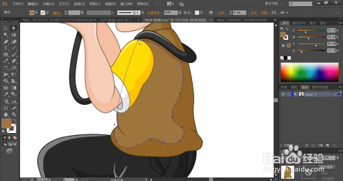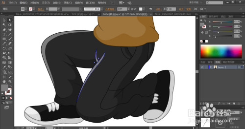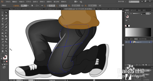 男孩的鞋带用灰白色填充,利用网格东西点击一下男孩的裤子的亮光路径让其呈现灰黑色渐变的结果,完当作摄影男孩形象设计。