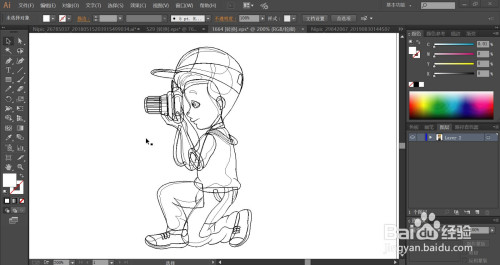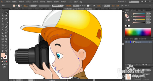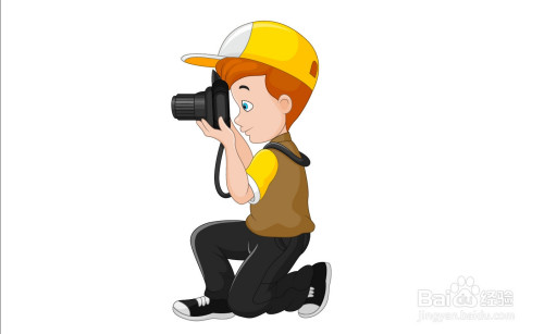利用钢笔画出男孩的帽子细节路径,再画出男孩的摄影动作,还有男孩手里的拍照机,男孩的上衣与裤子、鞋子的路径。