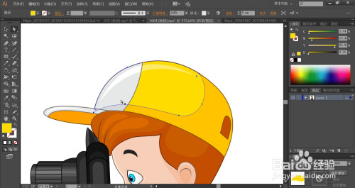 利用黄色与橙黄色搭配填充帽子,再用灰白色与橙黄色搭配填充帽子的左侧与帽沿的下方暗光路径。