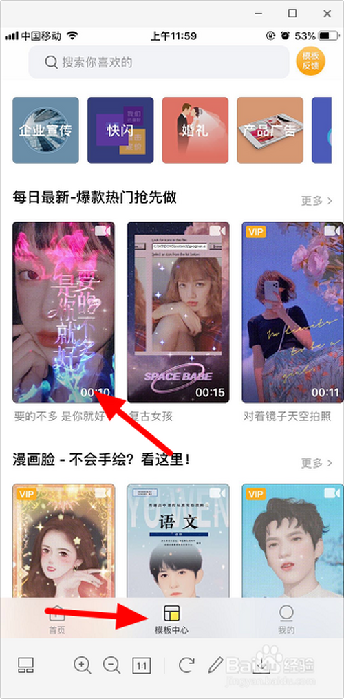 打开传影记,点击“模板中间”,进入“要的不多,是您就好”模板。