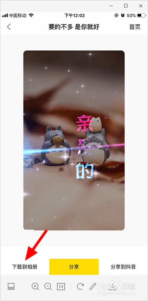点击左下角“下载到相册”,发到抖音就完当作了。