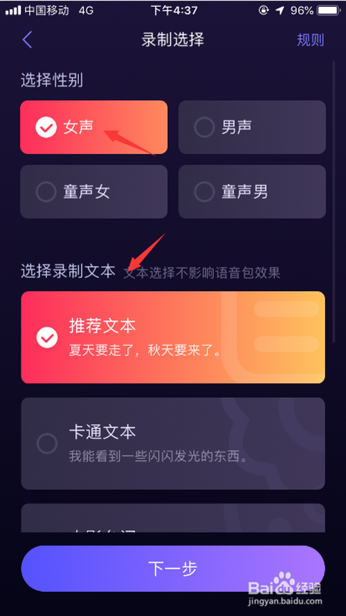 在“录制选择”页面,点选“选择性别”、“选择录制文本”。