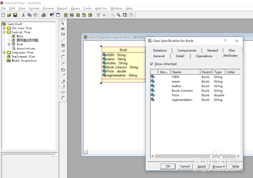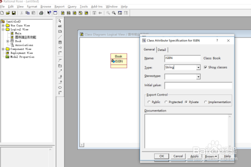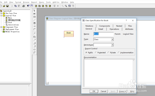 接下来的一步为设置类的属性,在类图中双击 Book 类,可以在打开的“Class Specification”对话框中设置 Book 类的属性和方式等其他的信息,如图所示