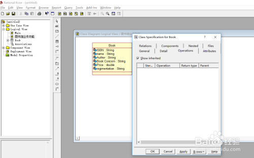 设置好 Book 类的属性,此刻来设置 Book 类的方式(也是操作),双击 Book 类后 在“Class Specification”对话框中选“operations”这个选项卡,可以看到如图所示。