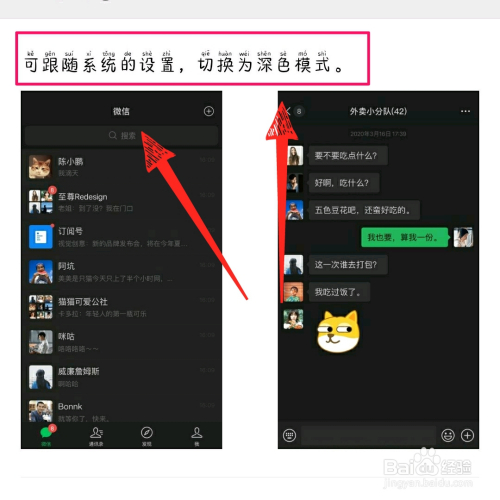 10.最后如下图所示,再进入微信发现本家儿题已经随系统改为暗黑模式。