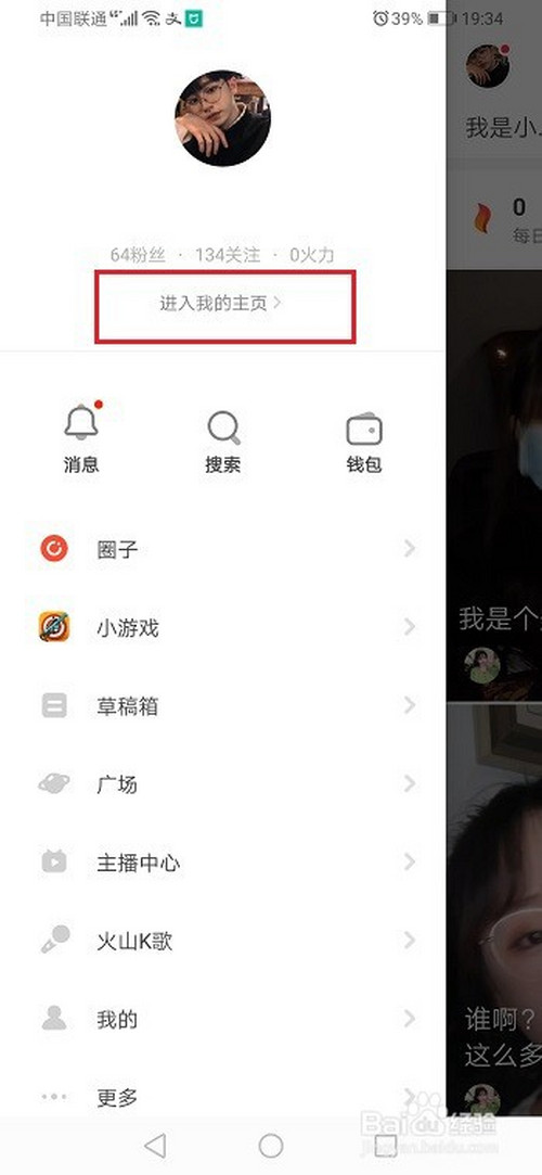 第一步打开抖音火山版,进去侧边栏,点击进入我的本家儿页,如下图所示:
