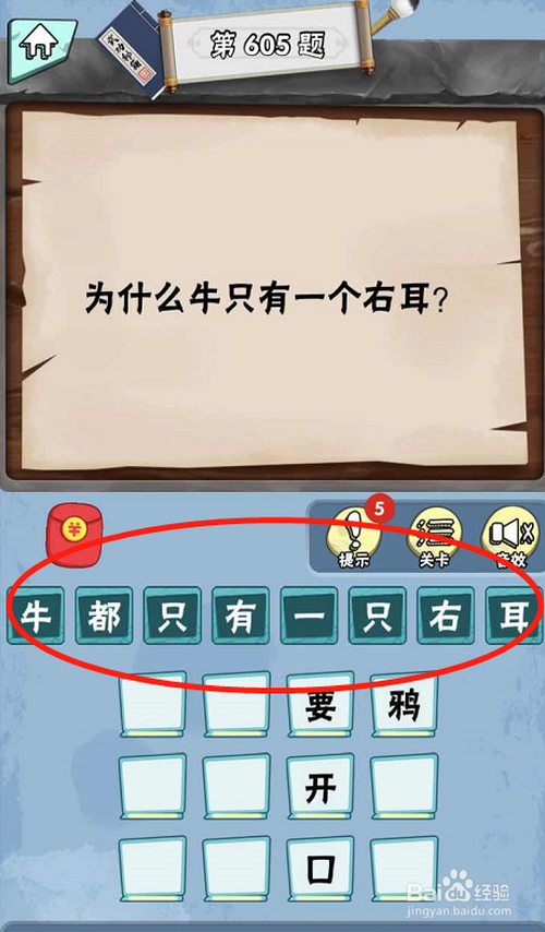 脑子急转弯达人游戏Lv5诺奖得本家儿605关内,提问为什么牛只有一个右耳。
