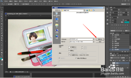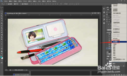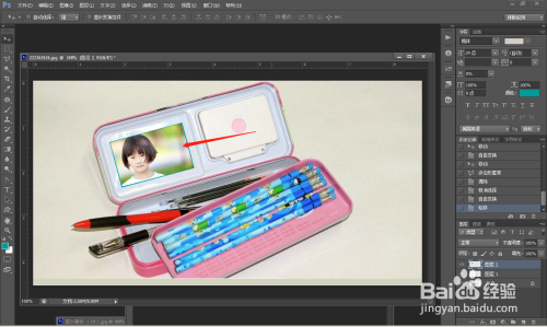 第四步:调整位置,载入图片。 将儿童照片移动到文具盒里面。看图