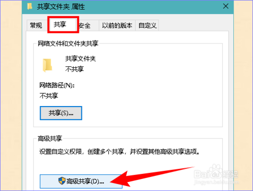 10、单机【共享】选项卡,再单机【高级共享】按钮;