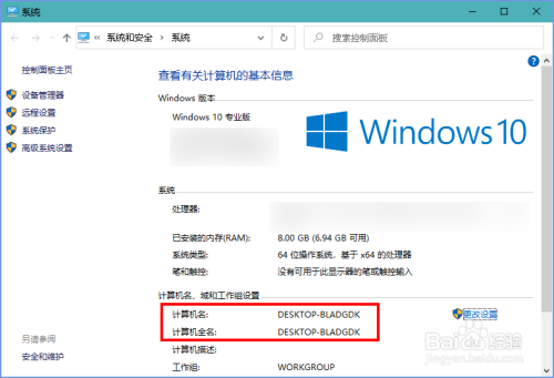 在打开的“系统”窗口中可以看到计较机的名称,如下图所示:
