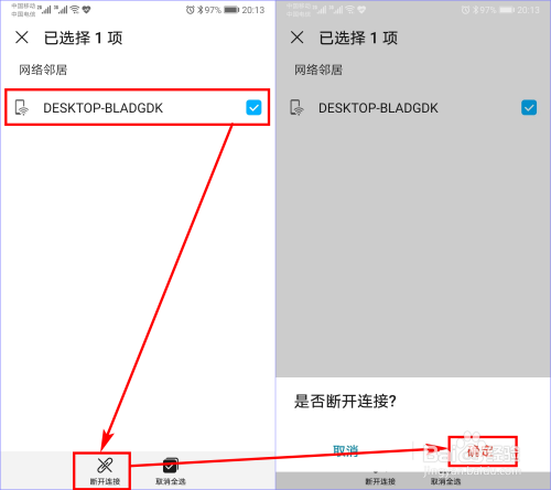 若要竣事共享,可以长按选中正在共享的设备名称,点击底部的【断开毗连】,再点击【确定】即可。