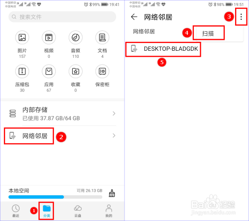 此刻,我们打开手机上的【文件办理】,点击底部的【分类】,再点击【收集邻人】,然后点击共享的计较机名称。若没有呈现设备名称,可以点击右上角三个点,再点击【扫描】,扫描收集中的设备名称。