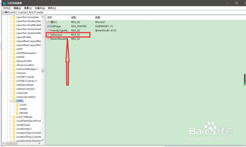 5、在打开的右侧列表中找到“isShortcut”,点击鼠标右键,进行删除。
