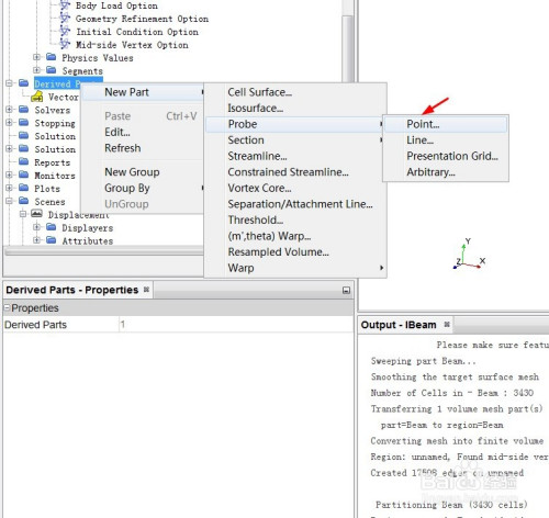 END点击Derived Parts > New Part > Probe > Point,Input Parts选择Parts > Beam,点坐标设为[50, 100, 0] mm,勾选No Displayer,点击Create,定名为Corner-Point。