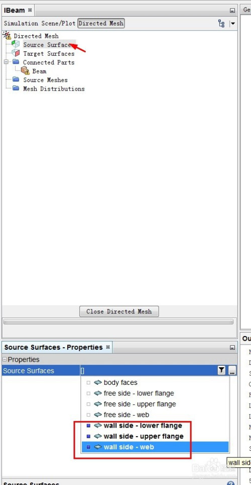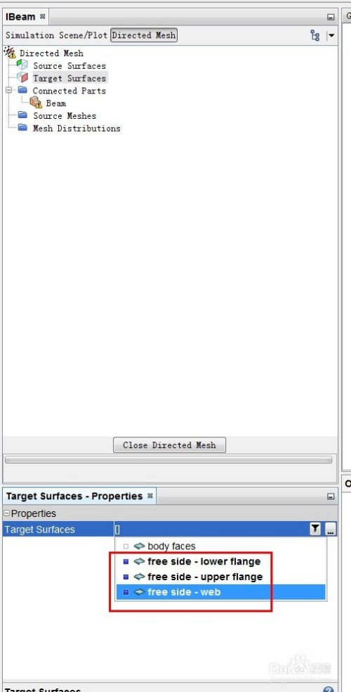 右键Directed Mesh设置网格。Source Surfaces选择wall side - lower flange、wall side - upper flange、wall side - web,Target Surfaces选择free side - lower flange、free side - upper flange、free side - web。