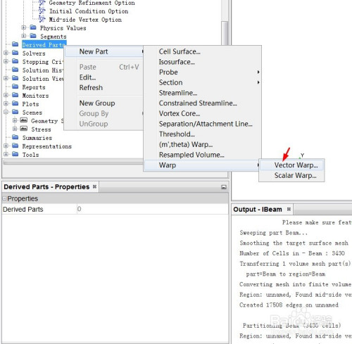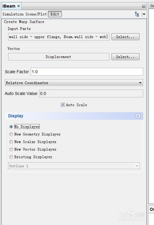点击Derived Parts > New Part > Warp > Vector Wrap。Input Parts选择Parts > Beam,Vector选择Displacement,勾选Auto Scale,选择No Displayer,点击Create。