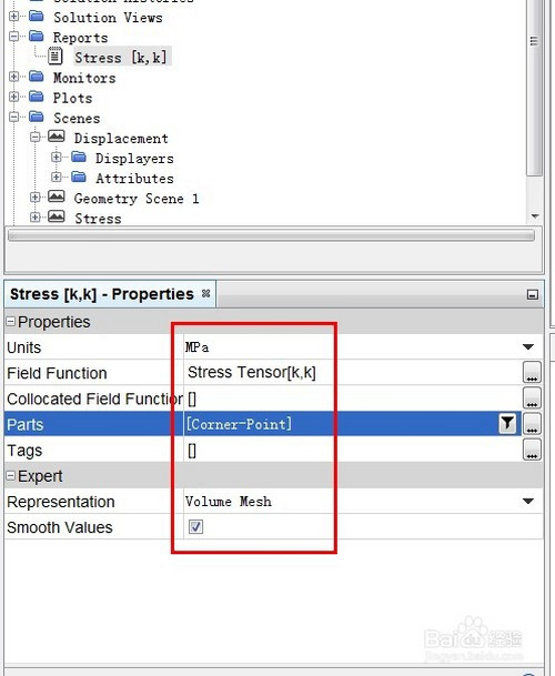 监测最大应力。右键Reports选择New Report > Maximum,定名为Stress [k,k],Field Function选择Stress Tensor [k,k],单元选择MPa,Parts选择Corner-Point,勾选Smooth Values。