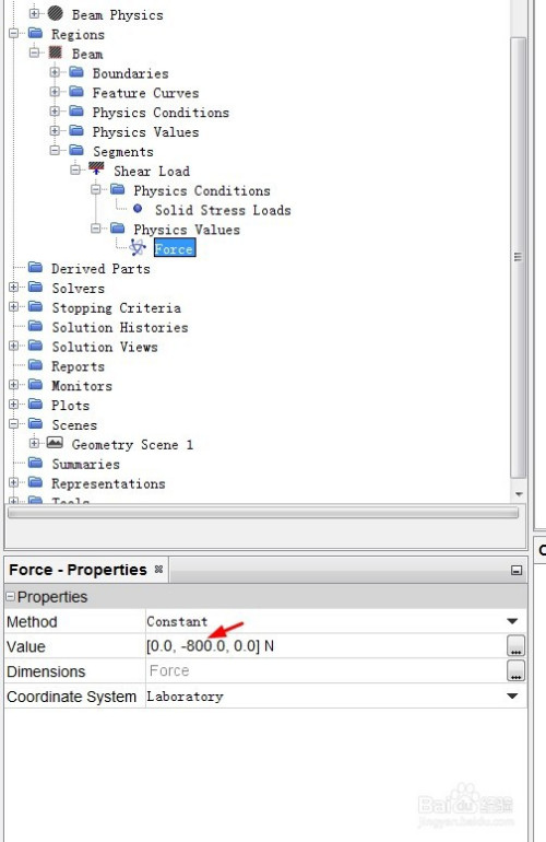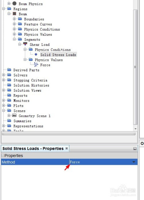 睁开Shear Load > Physics Conditions > Solid Stress Loads,Method选择Force。