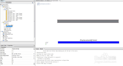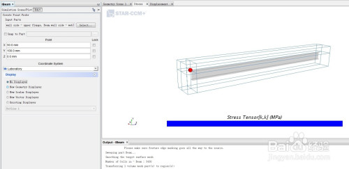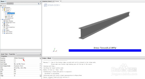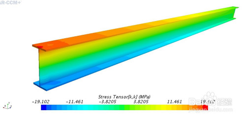 END监测轴标的目的应力张量。新建Scalar Scene,定名为Stress。Scalar Field选择Stress Tensor > Laboratory > k,k,单元为MPa;Parts选择Parts > Beam,Contour Style选择Smooth Filled。 点击Color Bar,将Title Height设为0.04,Label Height设为0.035。